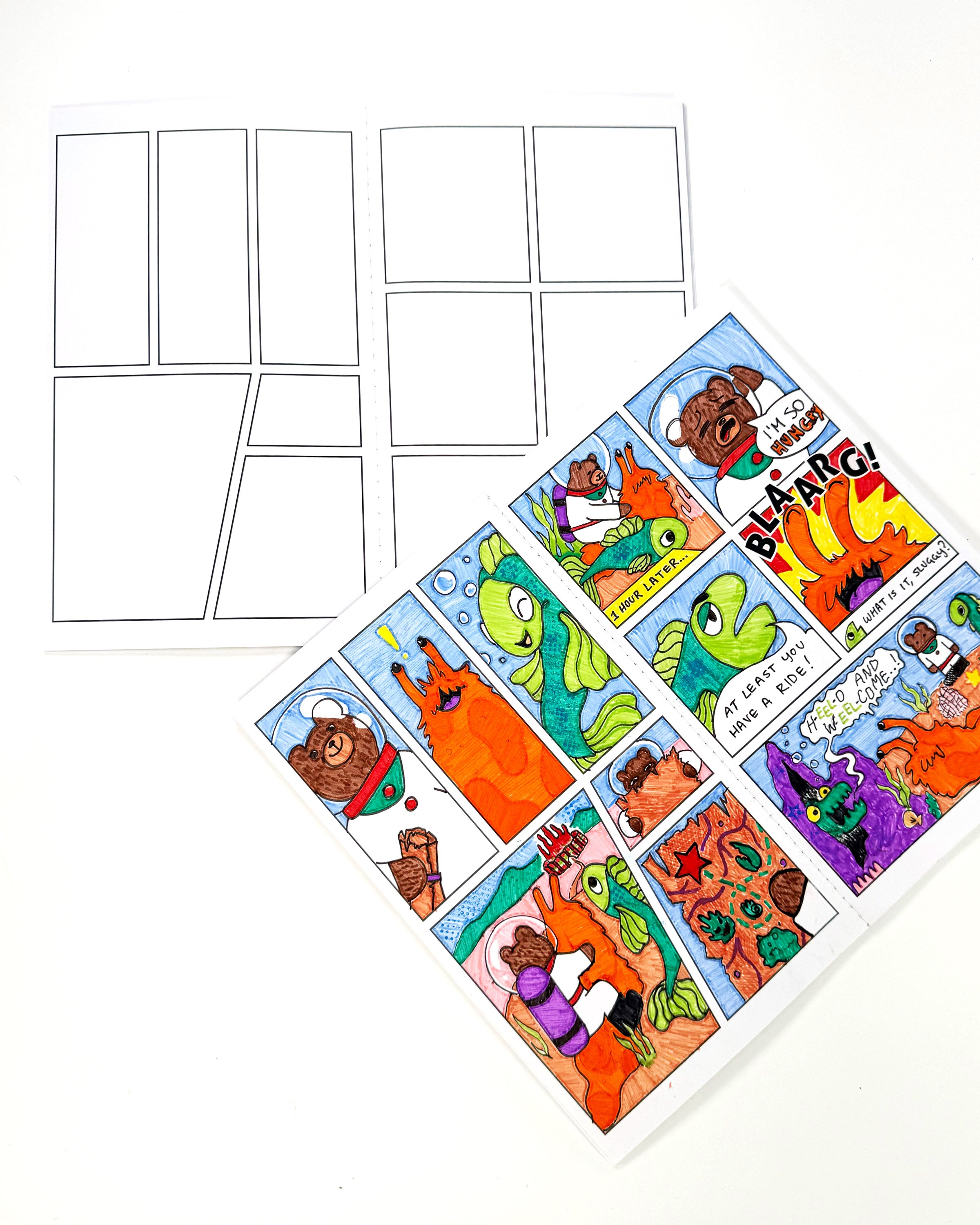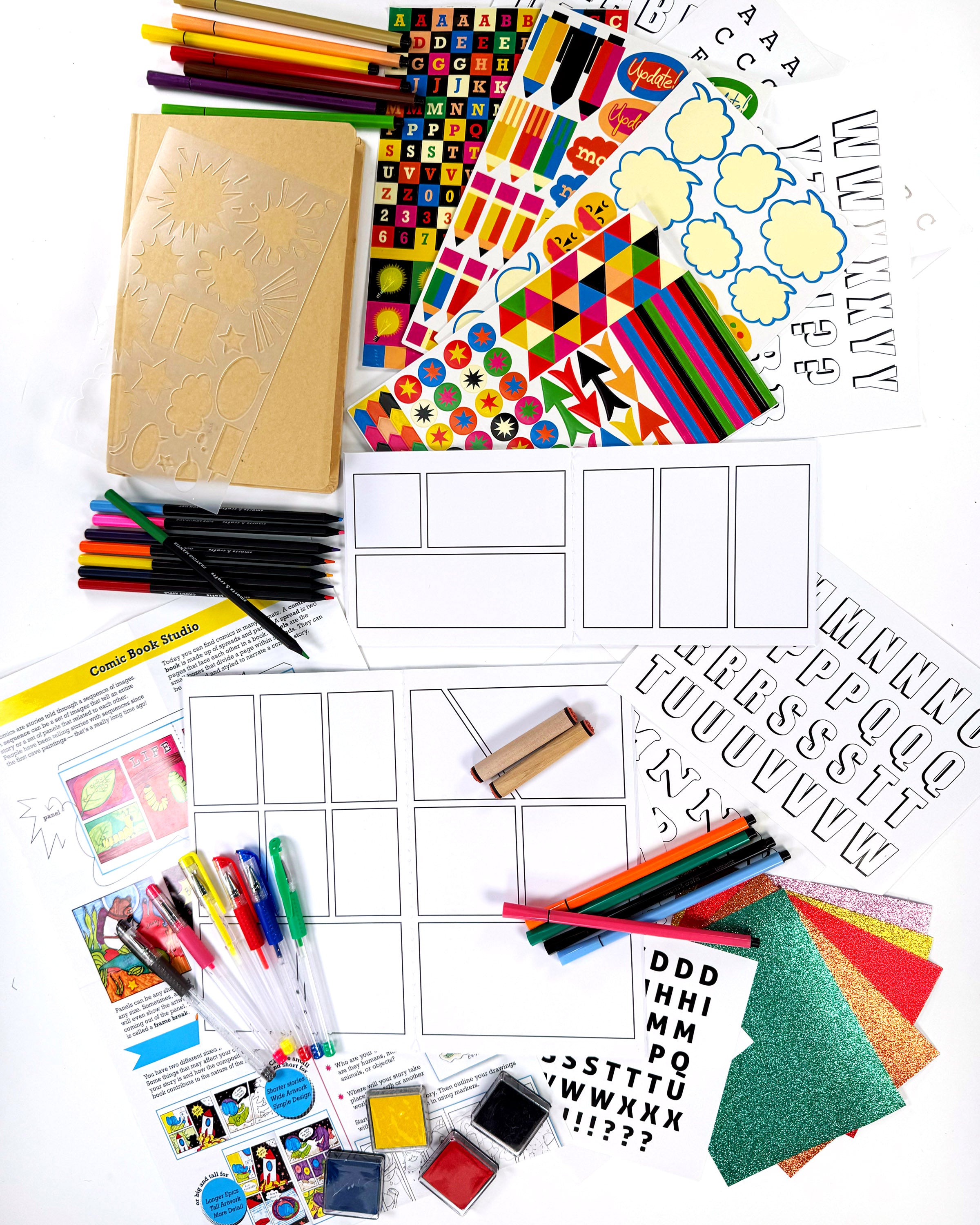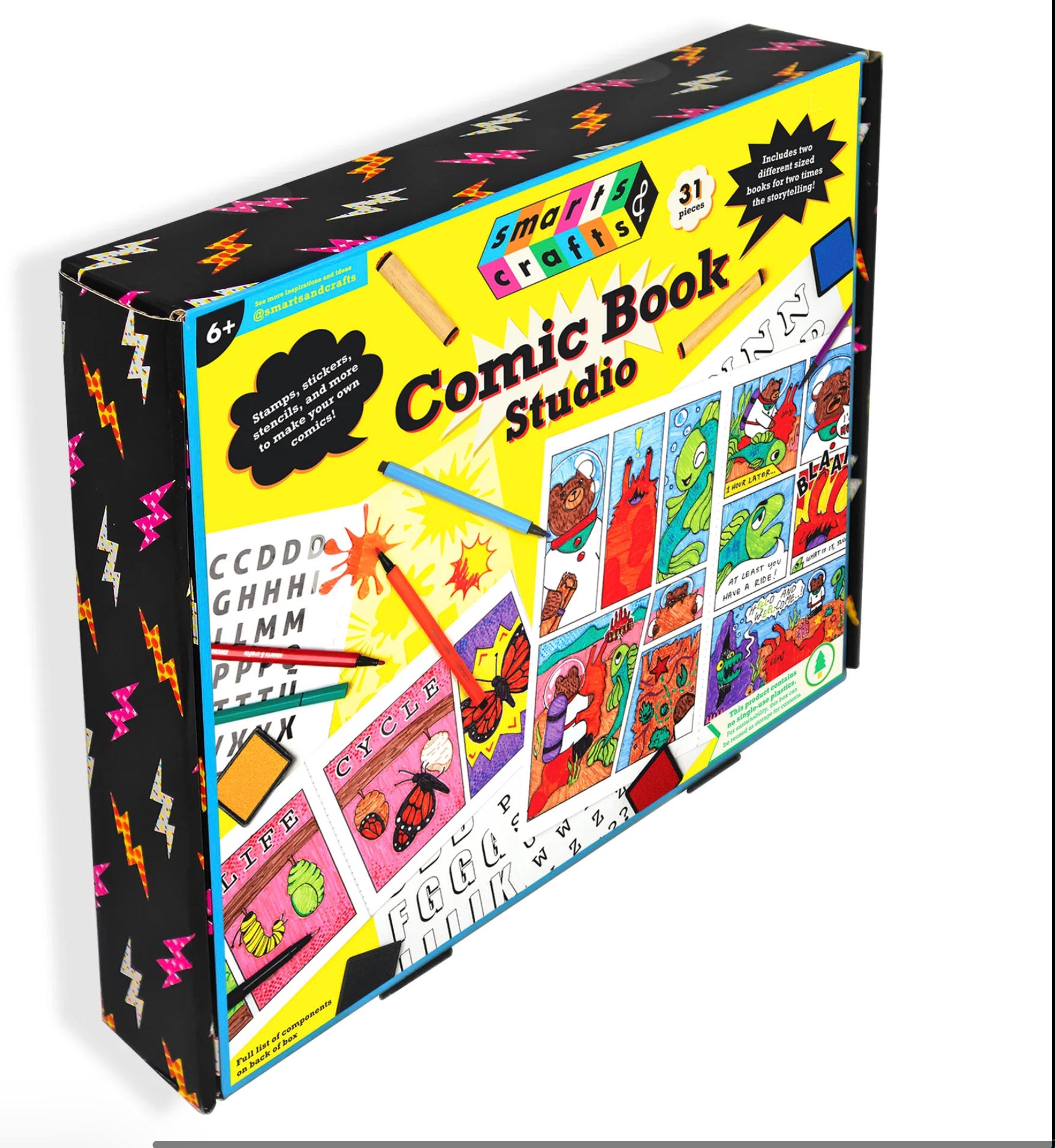 - Comic Book Studio Kit – Make your own comic books with 2 blank books (1 large, 1 small), alphabet stickers, stencil, ink pads, and a how-to guide. Perfect for action-packed adventures or silly fun!